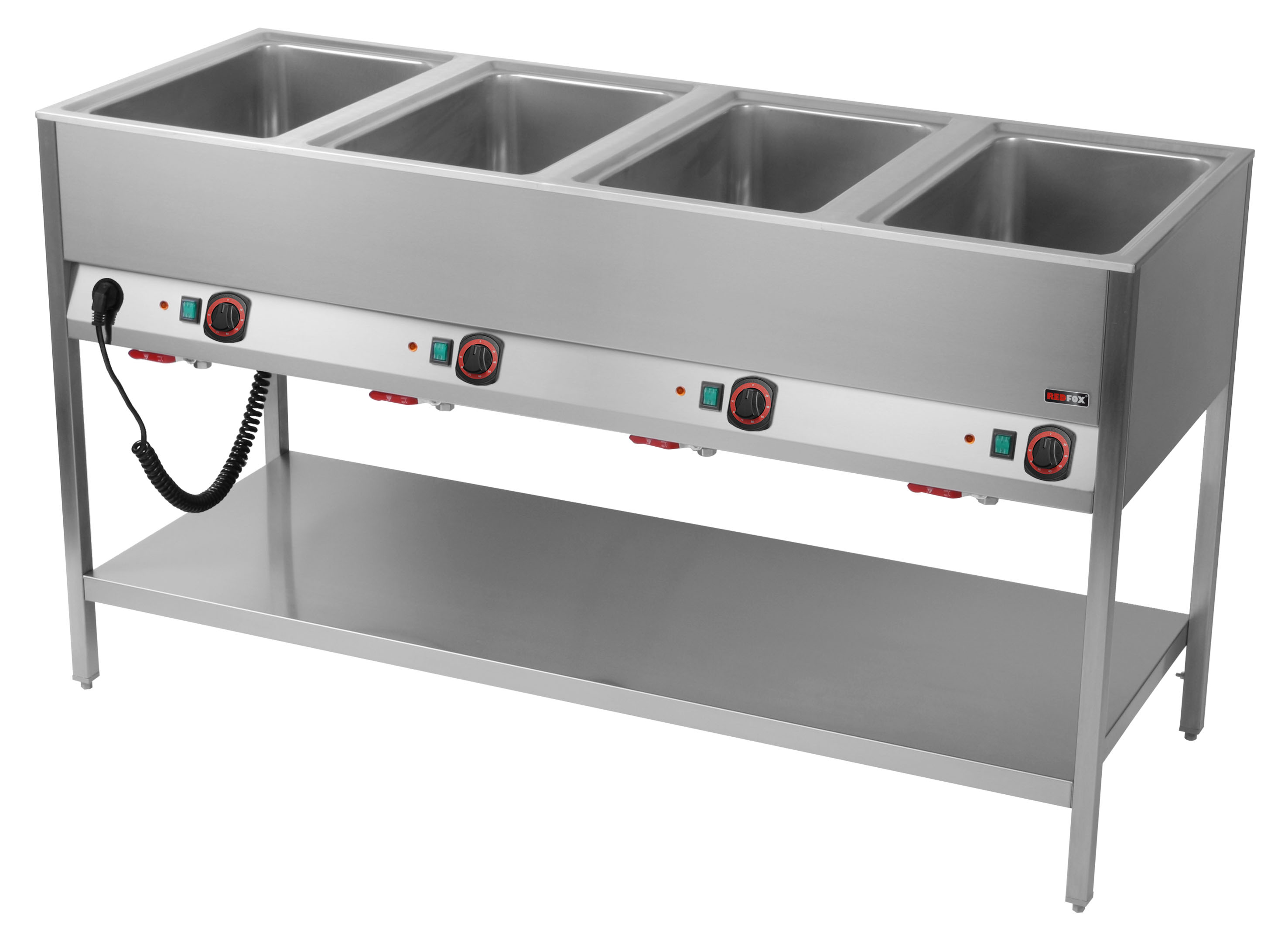 Bain-Marie-Station, mit geteilten Becken und getrennter Regelung, ergonomisches Bedienfeld an der längeren Seite des Geräts. Statische Ausführung ohne Rollen. Grundboden als Ablagefläche für GN-Einsätze oder Servierplatten nutzbar. Becken mit ergonomischen Innenformen und Ablaufhahn für eine einfache Reinigung. Breite: 1600 mm Tiefe: 670 mm Höhe: 900 mm GN: 4x GN 1/1 - 200 Bedienpaneel: lange Seite Temperaturbereich: 30°C bis 90°C Elektrischer Anschluss: 230V / 2,8 kW Gewicht: 67,2 kg / 80,7 kg Rollen: Nein