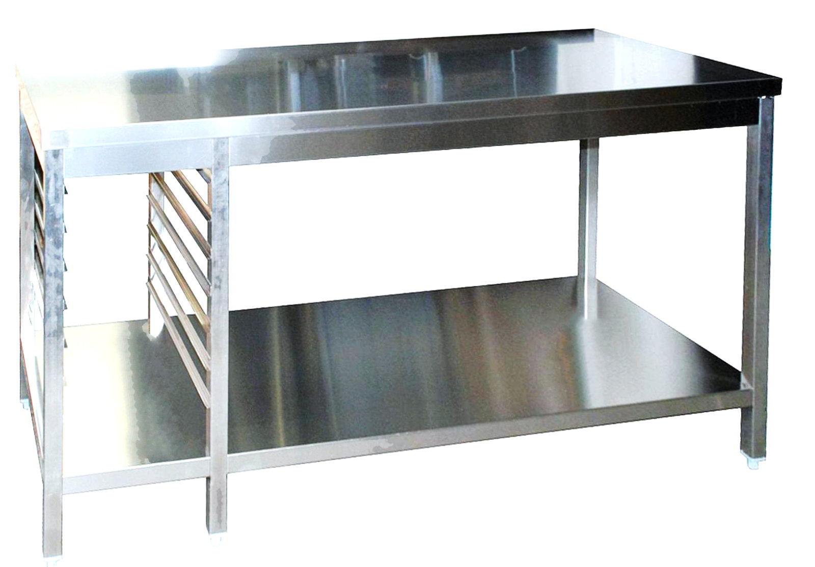 Arbeitstisch mit Grundboden und mit 7 Auflagewinkel für GN 1/1 links Höhe: 850 mm + 35 mm Bautiefe 700 mm Gestell dreiseitig verstrebt und verschweißt Tischplatte 40mm dick, mit Spanplatte (19mm) unterfüttert und beidseitig beschichtet Gebürstete Oberfläche der Bleche Blechdicke: 1,00 mm Aus Edelstahl AISI 304 (V2A) Füße aus 40 x 40 mm Vierkantrohr, 1,2mm Wanddicke Füße höhenverstellbar Mit 6 Füßen Ohne Aufkantung Alle Sondermaße auf Anfrage