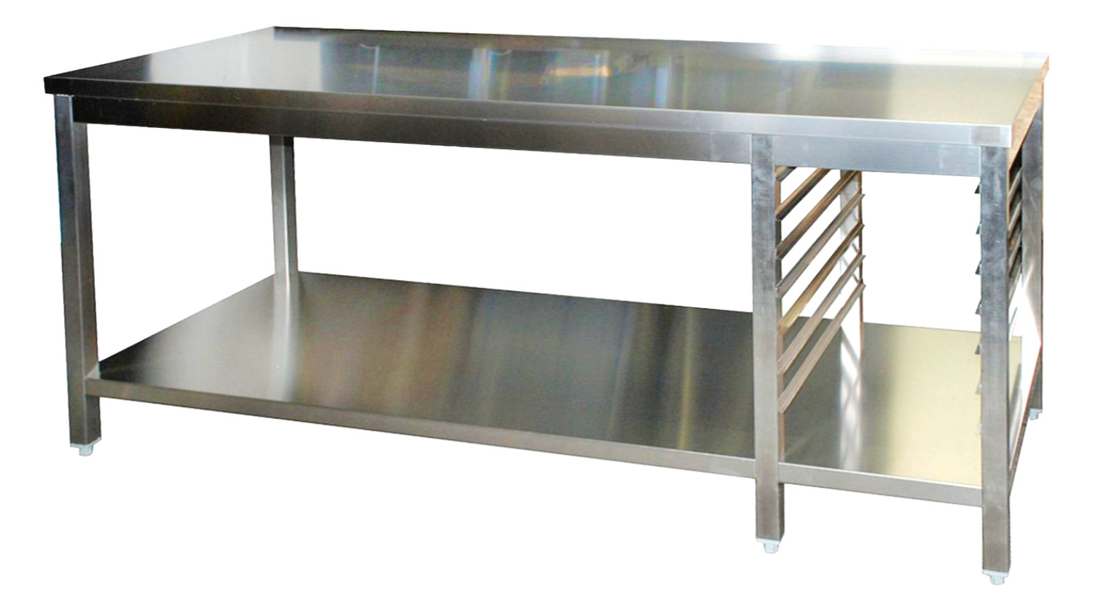 Arbeitstisch mit Grundboden und mit 7 Auflagewinkel für GN 1/1 rechts Höhe: 850 mm + 35 mm Bautiefe 700 mm Gestell dreiseitig verstrebt und verschweißt Tischplatte 40mm dick, mit Spanplatte (19mm) unterfüttert und beidseitig beschichtet Gebürstete Oberfläche der Bleche Blechdicke: 1,00 mm Aus Edelstahl AISI 304 (V2A) Füße aus 40 x 40 mm Vierkantrohr, 1,2mm Wanddicke Füße höhenverstellbar Mit 6 Füßen Ohne Aufkantung Alle Sondermaße auf Anfrage