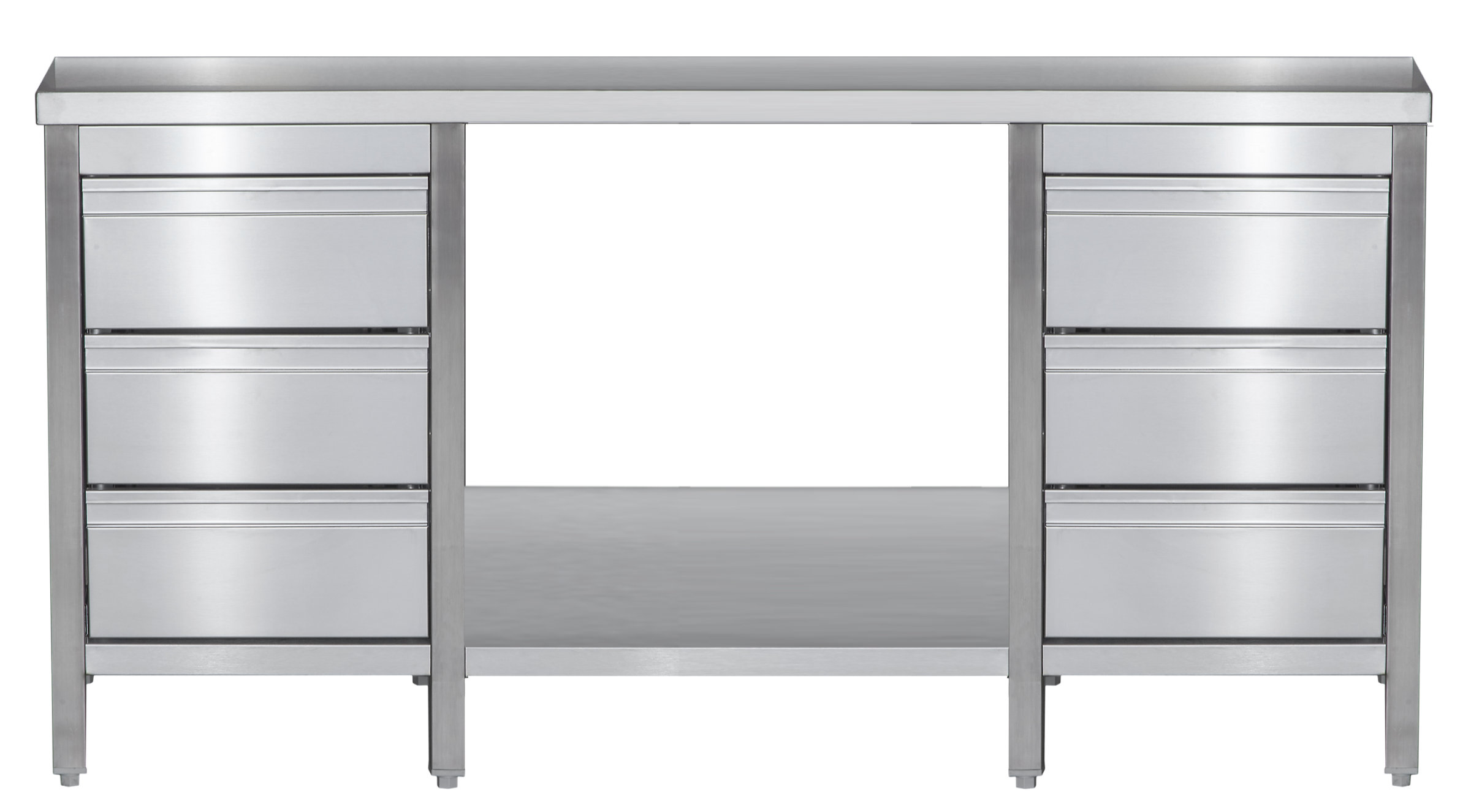 Arbeitstisch mit Grundboden und mit Schubladenblock links und rechts Höhe: 850 mm + 35 mm Bautiefe 700 mm Gestell dreiseitig verstrebt und verschweißt Tischplatte 40mm dick, mit Spanplatte (19mm) unterfüttert und beidseitig beschichtet Gebürstete Oberfläche der Bleche Blechdicke: 1,00 mm Aus Edelstahl AISI 304 (V2A) Füße aus 40 x 40 mm Vierkantrohr, 1,2mm Wanddicke Füße höhenverstellbar Mit 8 Füßen Ohne Aufkantung Alle Sondermaße auf Anfrage