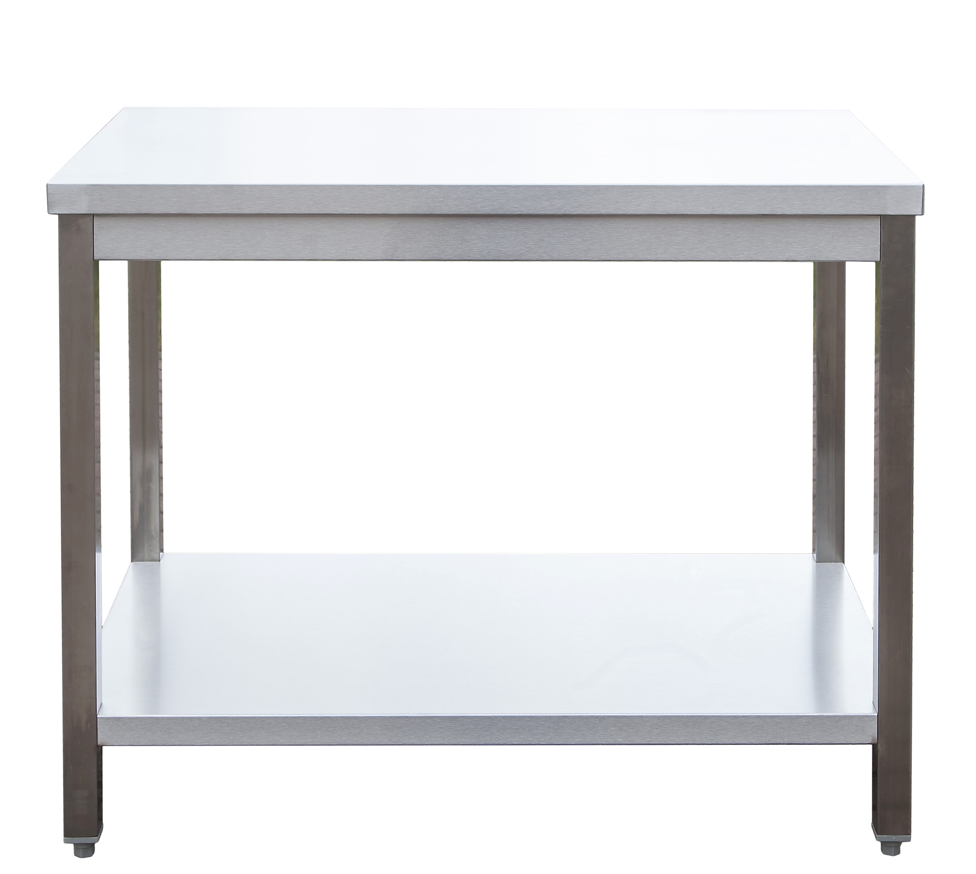 Arbeitstisch mit Grundboden Höhe: 850 mm + 35 mm Bautiefe 700 mm Gestell dreiseitig verstrebt und verschweißt Tischplatte 40mm dick, mit Spanplatte (19mm) unterfüttert und beidseitig beschichtet Gebürstete Oberfläche der Bleche Blechdicke: 1,00 mm Aus Edelstahl AISI 304 (V2A) Füße aus 40 x 40 mm Vierkantrohr, 1,2mm Wanddicke Füße höhenverstellbar Ab 2300 mm Breite mit 6 Füßen Ohne Aufkantung Alle Sondermaße auf Anfrage