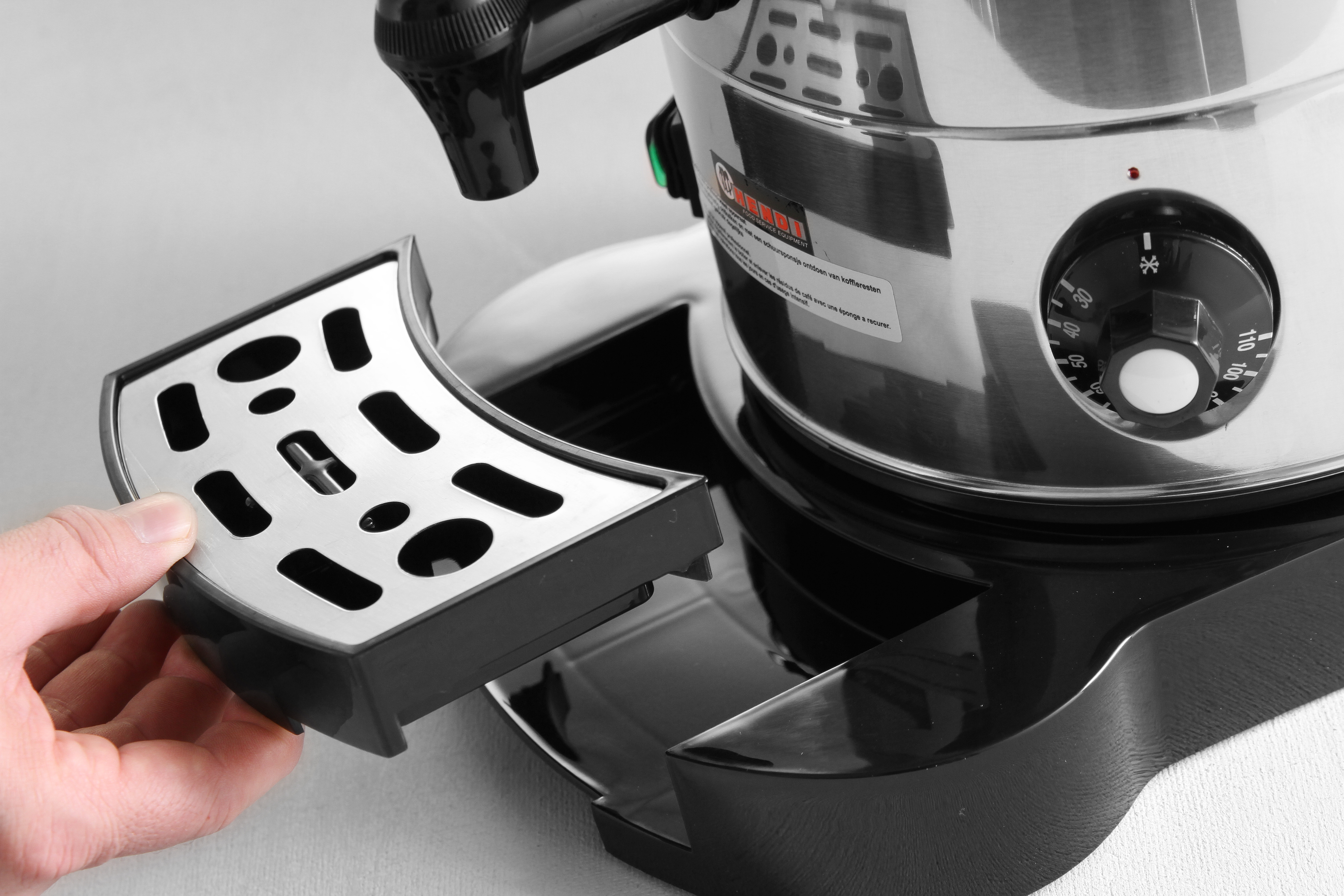 Doppelwandig isolierte und hochglanzpolierte Edelstahlausführung verringert den Wärmeverlust durch Wärmeabstrahlung. Thermostatische Temperaturregelung bis 100°C. Diese Eigenschaften verringern den Energieverbrauch um bis zu 20% gegenüber einwändigen Geräten. Korpus und Tank aus Edelstahl. Wartungsfreies Heizelement unter dem Tank. Sämtliche Teile sind zur leichten Reinigung einfach zu entnehmen. Punktgeschweißte und silikonbeschichtete Edelstahlgriffe. Non-Drip Hahn. Standrohr zur Anzeige des Füllstandes. Entkalkungsanzeige. Abtropfgitter aus Edelstahl. Nicht geeignet für Kakao. Energiesparende Produkte. Edelstahl.