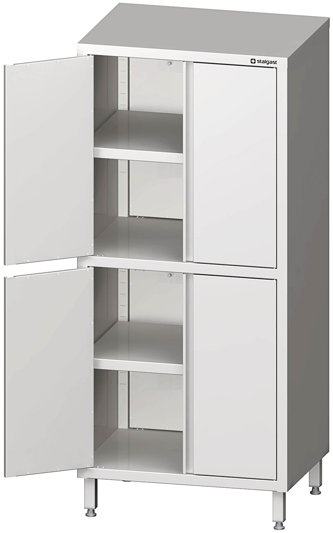 hergestellt aus rostfreiem, ferritischem Stahl, fest verschweißte Ausführung, höhenverstellbare Füße +25 mm bis -4 mm, Schrankbeine aus Vierkantprofil 40x40 mm, Materialstärke: 1,2 mm, Schrankinnenräume mit einem höhenverstellbaren Einlegeboden, mittlerer Schrankboden fixiert, Flügeltüren sind doppelwandig ausgeführt, mit durchgehender Griffleiste und Magnetschließer