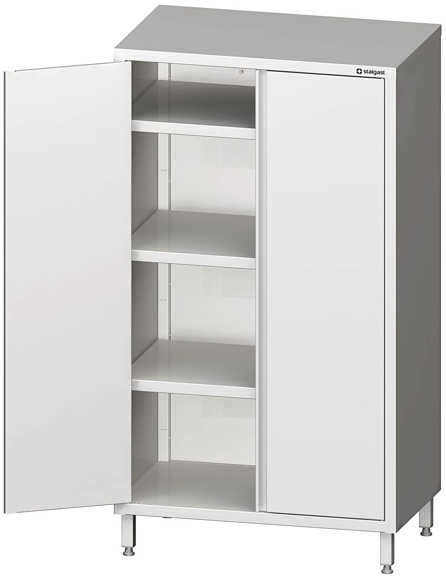 hergestellt aus rostfreiem, ferritischem Stahl, fest verschweißte Ausführung, höhenverstellbare Füße +25 mm bis -4 mm, Schrankbeine aus Vierkantprofil 40x40 mm, Materialstärke: 1,2 mm, Schrankinnenraum mit drei höhenverstellbaren Einlegeboden, Flügeltüren sind doppelwandig ausgeführt, mit durchgehender Griffleiste und Magnetschließer, Scharniere auf der linken Seite beim Hochschrank mit B ? 600 mm