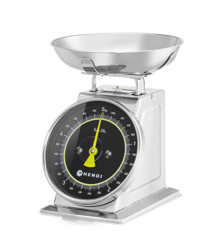 Aus Edelstahl gefertigt. Mechanische Anzeige, keine Batterien erforderlich. Graduierung: 20 g. Ablesen in kg. Abmessungen der Schale: Ø207x(H)42 mm Max. Fassungsvermögen: 5 kg Manueller Null-Reset. Genauigkeit: <1 kg, ±2d(40 g) 1-3 kg, ±3d(60 g) 3-5 kg, ±4d(80 g)Die HENDI Küchenwaage mechanisch, ist ideal für Küchen, in denen Langlebigkeit und eine einfache Handhabung im Vordergrund stehen und bietet gleichzeitig zuverlässige Leistung. Wiegt bis zu 5 kg und verfügt über eine Tara-Funktion für zusätzlichen Komfort.Klare und leicht ablesbare Analog-AnzeigeBis 5 kg GesamtgewichtKlassische mechanische Waage