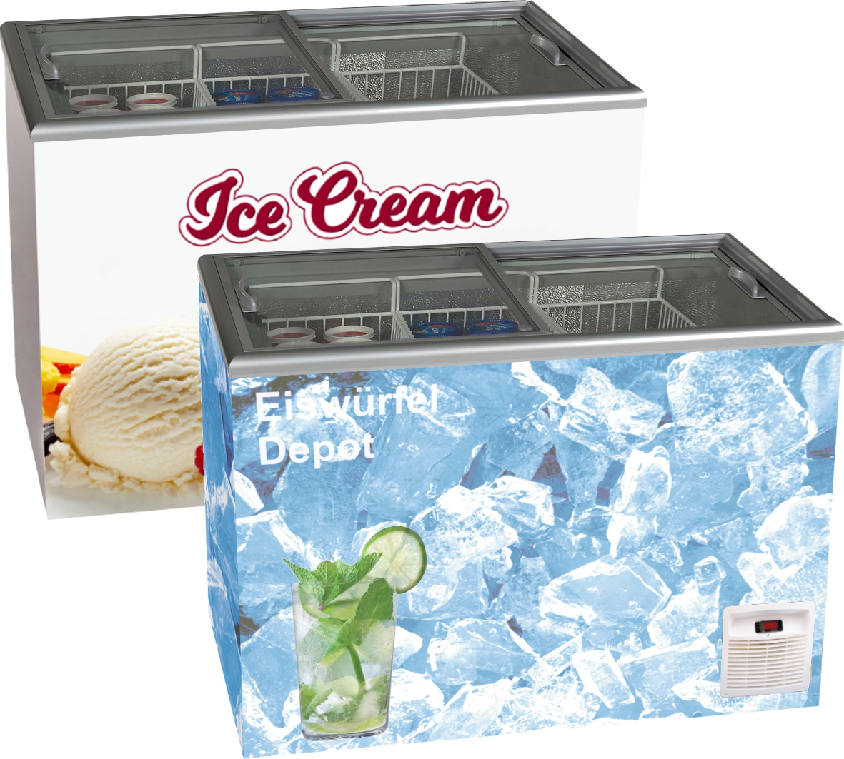 - Als Impuls-Tiefkühltruhe geeignet für den Verkauf von Eiswürfeln, Crushed Eis, Impulseis, Spirituosen usw.