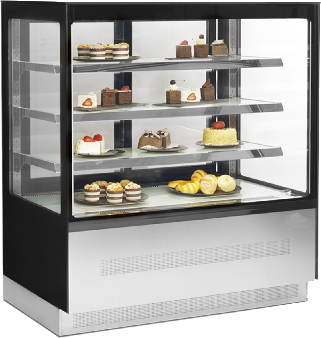 - Optimale Warenpräsentation, Gehäuse in Edelstahl, 4-seitige Verglasung, LED