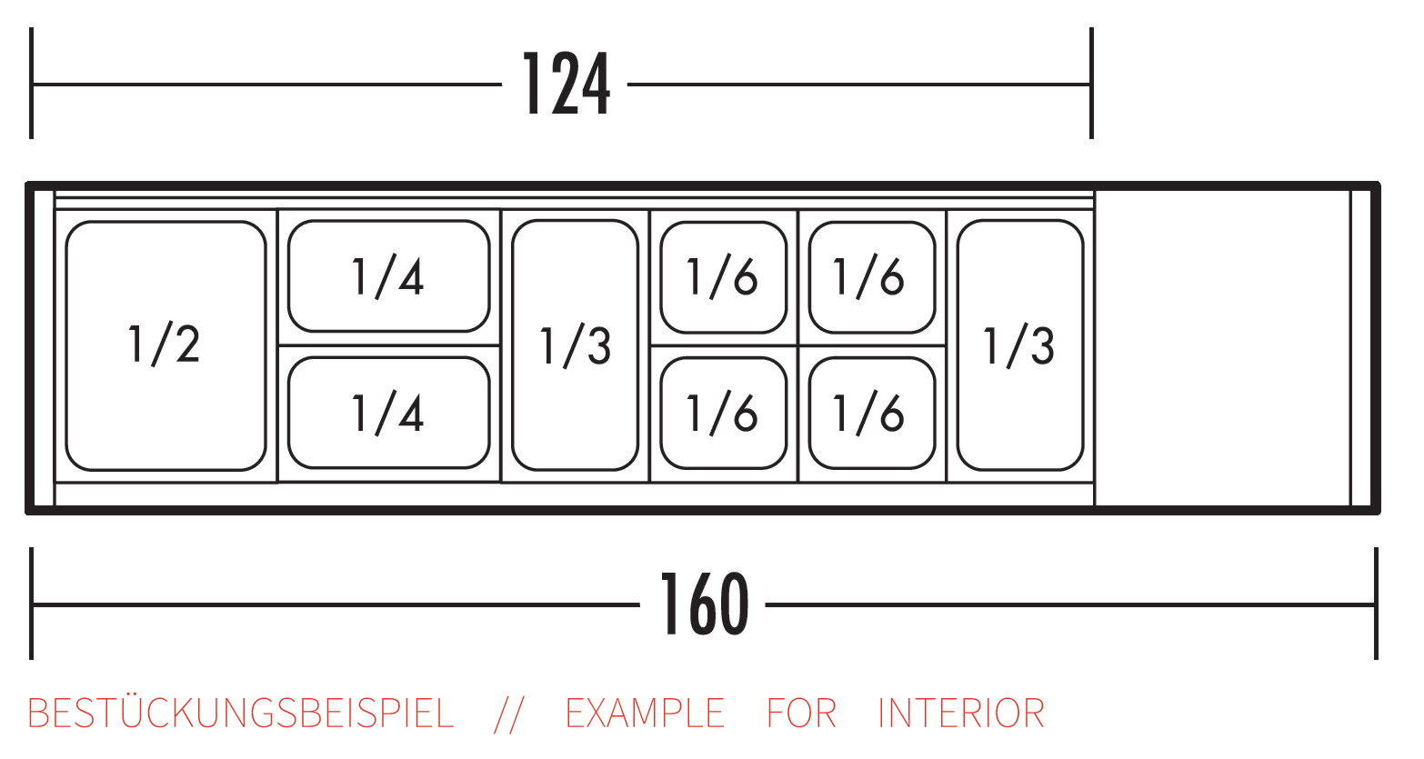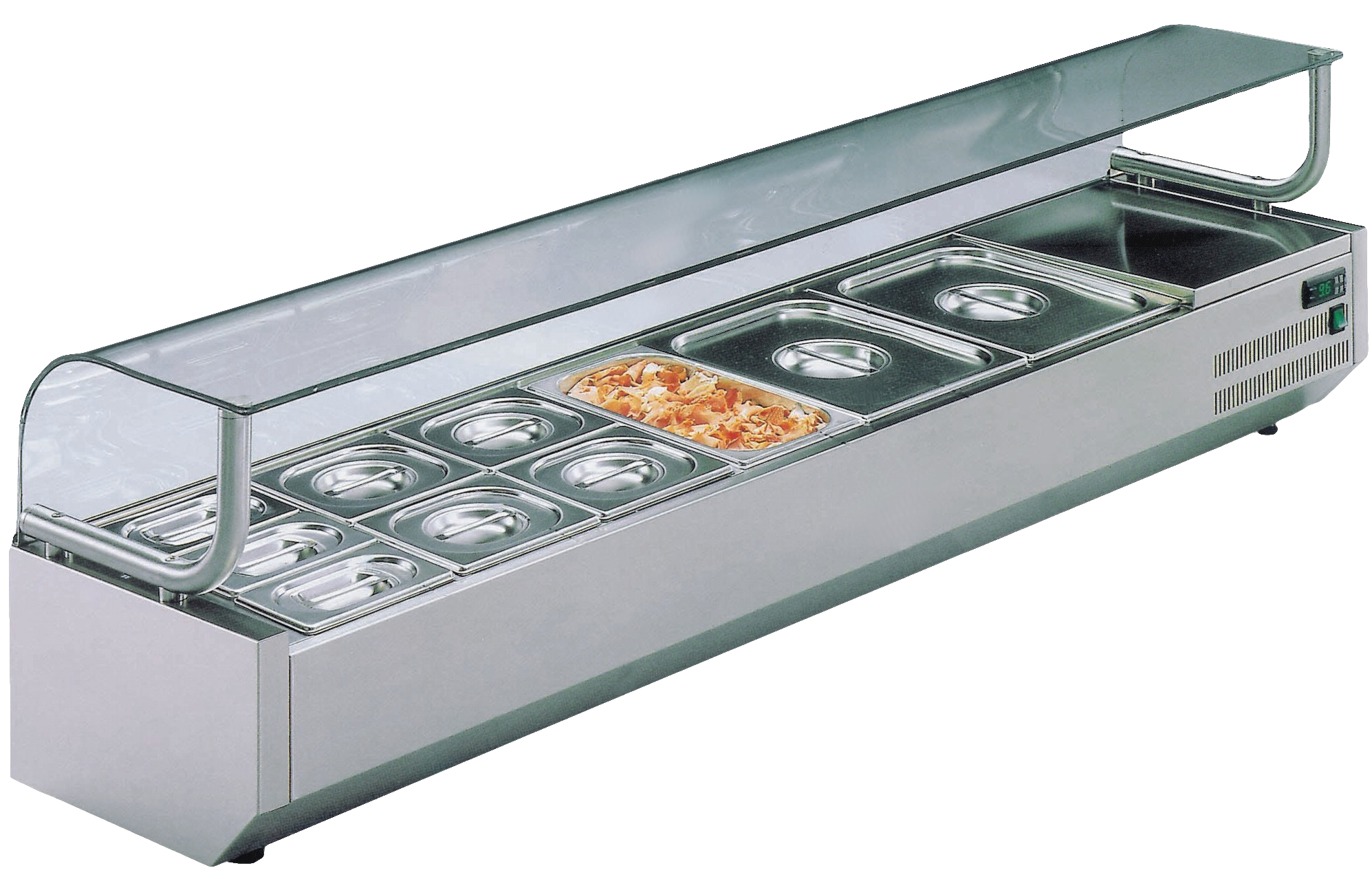 Beckenlänge 1040 mm - GN-Schalentiefe bis 150 mm - Kühlleistung 170 kcal/h - Gehäuse Edelstahl - Glasabdeckung - statische Kühlung im Wannenbereich +2° bis +8°C - FCKW-frei - ohne GN-Behälter