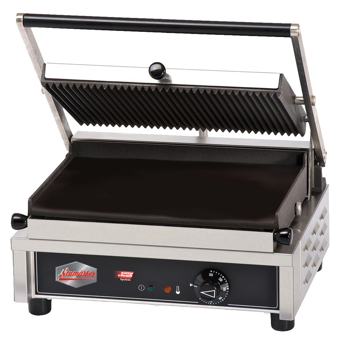 Grillfläche 350 x 230 mm - entnehmbare Grillplatten oben und unten geriffelt - untere Platte glatt oder geriffelt austauschbar (zusätzliche Wechselplatten nicht enthalten) - Platten aus emailliertem Grauguss - Easy-Clean-System für die Reinigung der Platten im Geschirrspüler - patentiertes Heizkörper-Pack für gleichmäßige Hitze und Energiespareffekt - Thermostat bis +300°C - Ein-/Ausschalter - Kontrollleuchte - Fettwanne