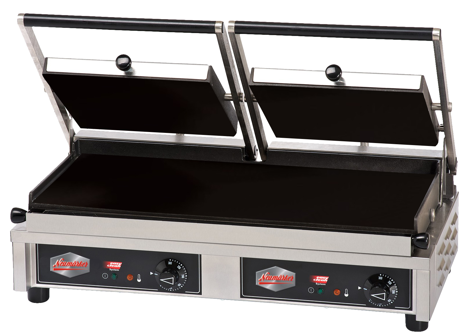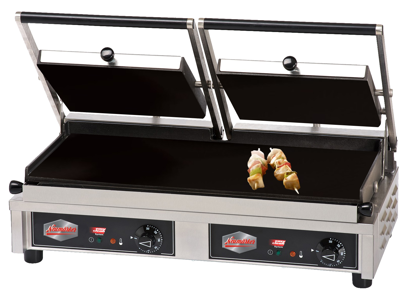 Grillfläche 550 x 230 mm - entnehmbare Grillplatten oben und unten geriffelt - untere Platte glatt oder geriffelt austauschbar (zusätzliche Wechselplatten nicht enthalten) - Platten aus emailliertem Grauguss - Easy-Clean-System für die Reinigung der Platten im Geschirrspüler - patentiertes Heizkörper-Pack für gleichmäßige Hitze und Energiespareffekt - 2 Thermostate bis +300°C (rechte/linke Hälfte getrennt regelbar) - Ein-/Ausschalter - Kontrollleuchten - Fettwanne