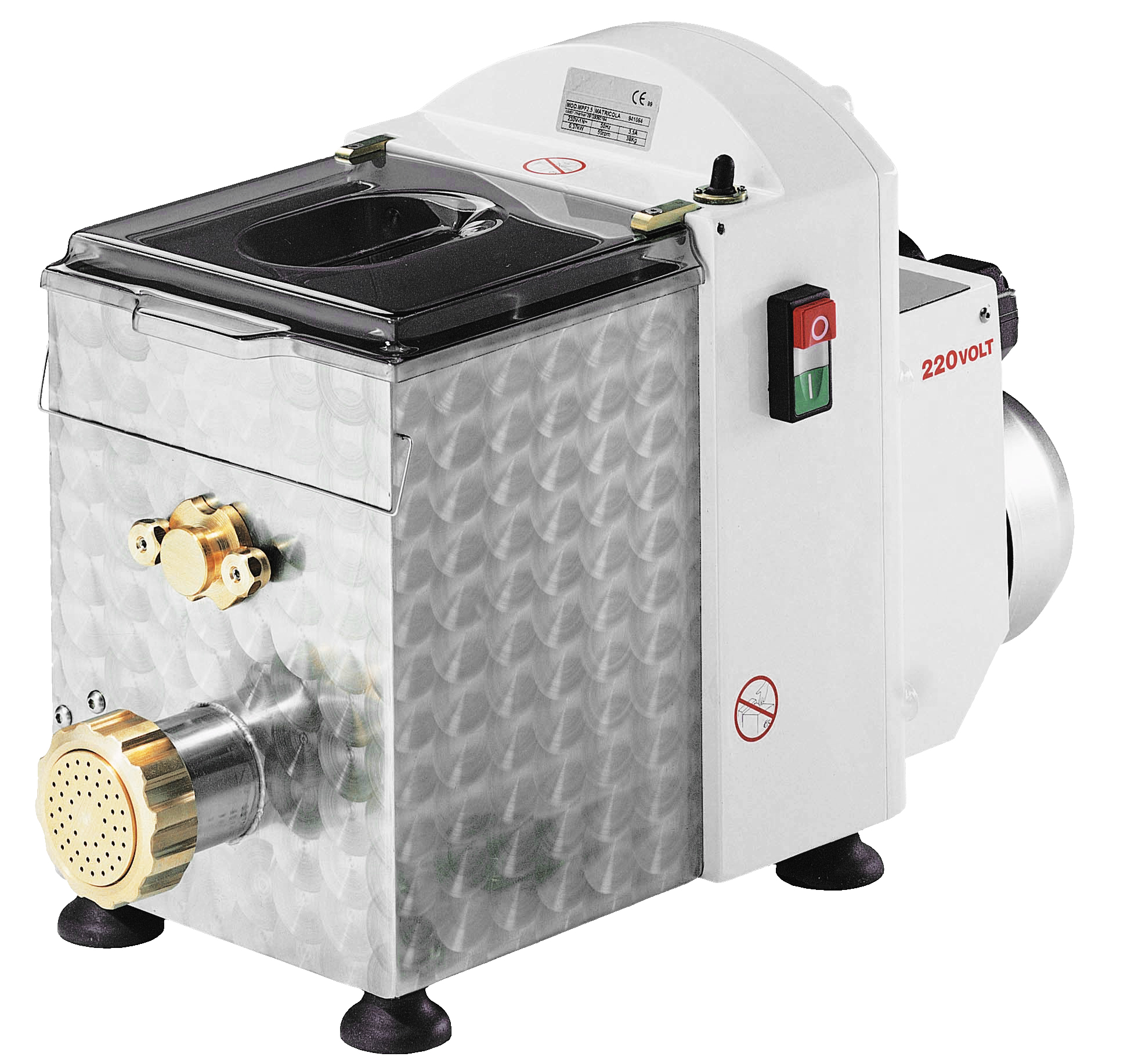 zum Kneten und Ausrollen verschiedener Pastasorten mit Ei - auswechselbare Scheiben nicht im Lieferumfang enthalten (Pasta-Scheiben auf Anfrage) - Gehäuse mit kratzfestem Lack beschichtet - Schraube in Messing-/ Bronzelegierung - Mikroschalter am Behälterdeckel - Behälter und Knethaken aus Edelstahl - Behälter für 4 kg Teig - Kapazität 13 kg/Stunde - Pasta-Scheiben ⌀ 57 mm - elektrischer Nudelteigschneider (nicht nachrüstbar, nicht separat erhältlich)