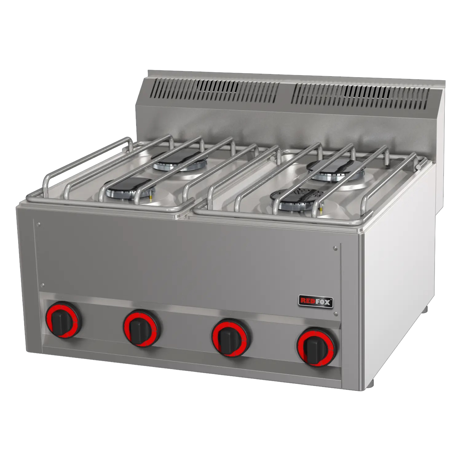 Thermik Serie 600 | Gasherd Aufstellart: Tischgerät Herdard: Gasherd Art der Kochstelle: Gas Sicherheitsthermoelement: Ja Brennerroste: AISI 304, Ã 10 mm Material Gehäuse: AISI 430 Material Arbeitsfläche: AISI 304 Steuerung: Drehregler Modell: SP-60GL Anzahl der Kochstellen: 4 Verteilung der Kochstellen: 2 x 3,0 kW + 2 x 3,6 kW Gasanschluss: 13,2 kW Maße: 660 x 600 x 290 mm Gewicht: 22,3 kg / 35,4 kg
