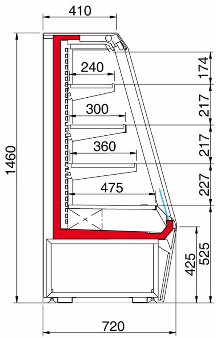- Eine Version Temperaturklasse 3M1 für verpackte Fleisch- und Geflügelprodukte und Hackfleisch mit elektrischer Abtauung und Frontverglasung ist lieferbar gegen Mehrpreis (mit elektrischer Abtauung)